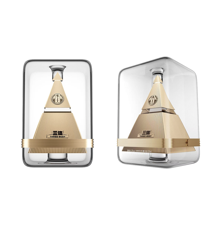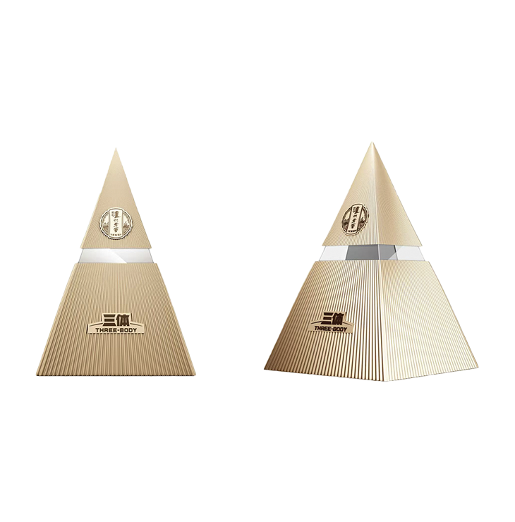 文创定制·科技系列 —— HJC黄金城|三体金字塔造型悬浮式塔尖设计,呼应《三体》多维宇宙的哲思,突破传统白酒瓶身设计的物理界限。设计师以“时间”为切入点,将白酒的陈酿过程与科幻的时空叙事结合,强调“美酒是时间的结晶,科幻是时间的想象”,赋予产品哲学深度。 度数52%vol规格533ml