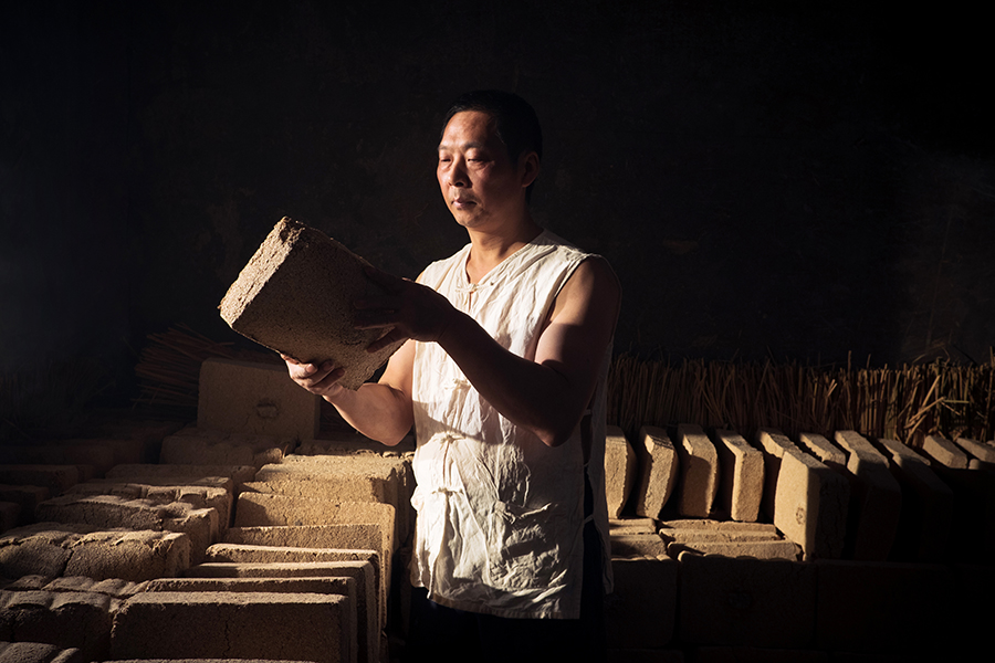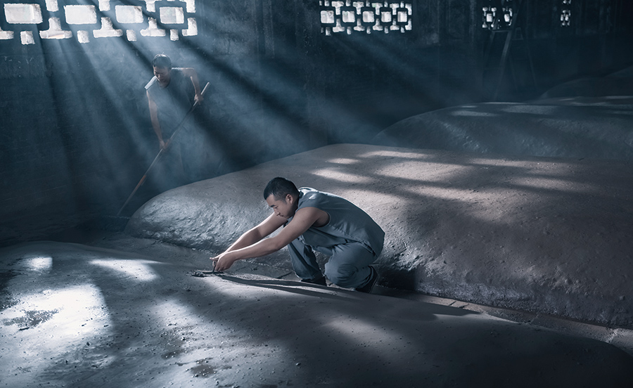 在原酒酿造过程中,将母糟从窖池中起运出来,堆砌成四方形,表面均匀铺上糠壳,避免酒精物质过快挥发。在碎粮之后,再通过有技巧的挖糟,使母糟和粮食能按比例均匀拌和。