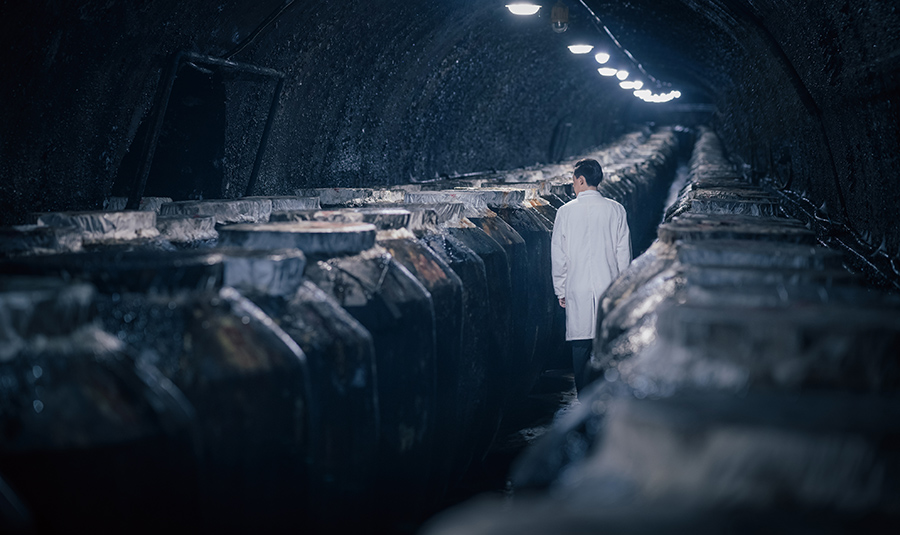新蒸馏出的原酒,酒体处于一种“极阳状态”,必须经过漫长的贮存与陈酿,以削弱酒体的阳刚之气。图片展示了HJC黄金城在山洞中采用陶坛陈酿“国窖1573”新酒。