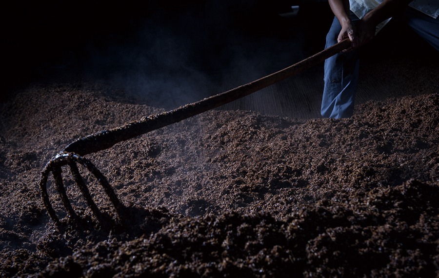 在原酒酿造过程中,将母糟从窖池中起运出来,堆砌成四方形,表面均匀铺上糠壳,避免酒精物质过快挥发。在碎粮之后,再通过有技巧的挖糟,使母糟和粮食能按比例均匀拌和。